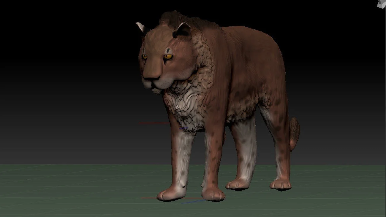 For this project, my professor provided the class with an assortment of animal models in FBX format to use as a starting point for our extinct species. These models included a cow, lizard, horse, and cat. Naturally, I used the cat as a base, and began modifying the mesh and sculpting it out using ZBrush. Bar none, the greatest challenge of this process was making the proportional adjustments needed for my sculpt. Lions aren’t just bigger house cats, but the way in which their bodies are proportioned is completely distinct. Big cats had broader heads, longer spines, larger and bulkier paws, and overall much more muscularity than house cats. For cave lions in particular, they are more robust and heavily built than African lions, meaning my model would have to reflect a degree of muscularity and heft that was beyond what my anatomical references showed.