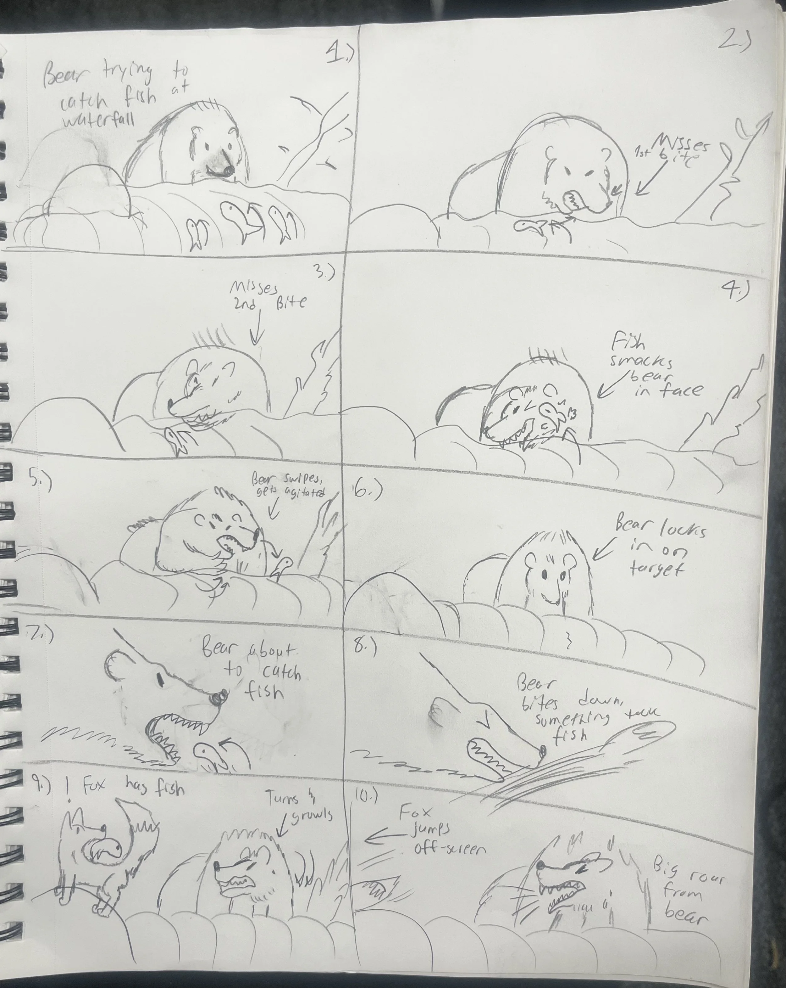 I drafted a storyboard to showcase the sequence that I would want my animation to follow. There would be a bear standing at mouth of a waterfall, trying but failing to catch 3 different salmon. Finally, just as he is poised to catch the final fish, a crafty fox jumps in from just out of frame to catch it, much to the bear’s dismay. The story was simple but effective, and though it was ambitious for only my second ever 3D animation, I was excited at the possibility.
