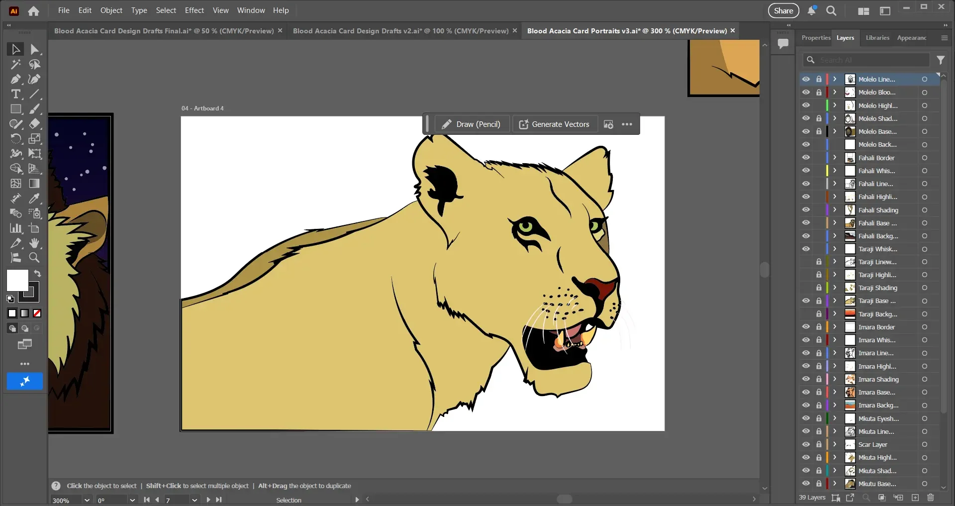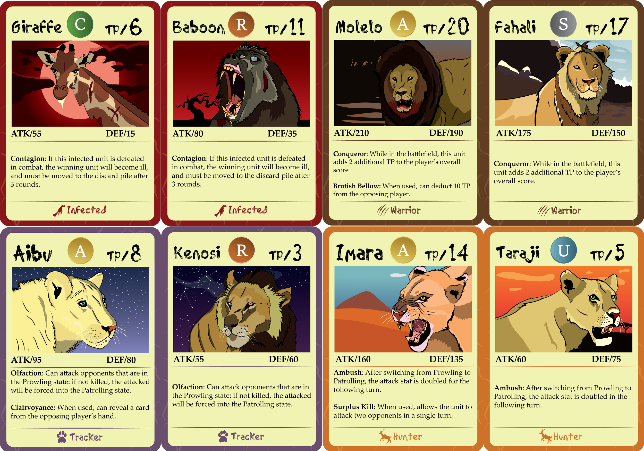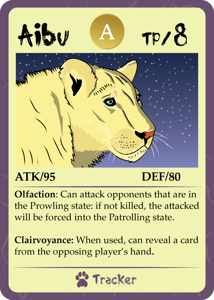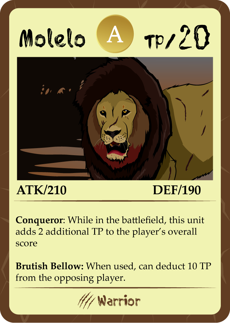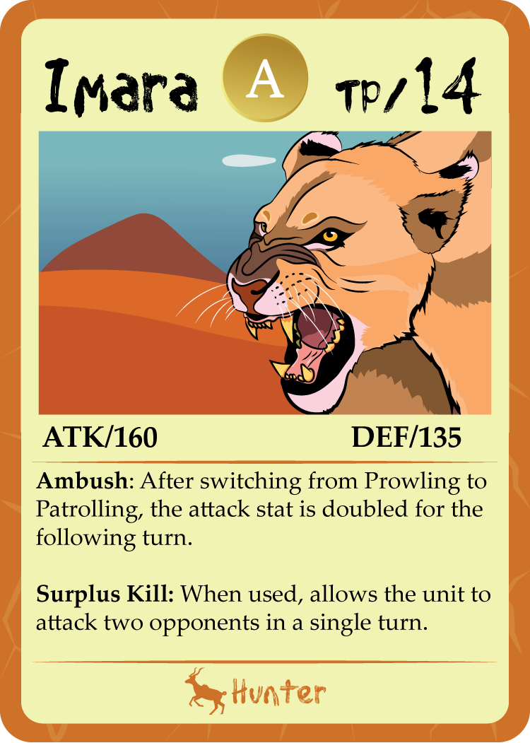When it came time to design the cards, I had to first establish the kind of game that I would be making. With the story centering around lions, fighting and killing were a very prominent aspect of the story. Therefore, a game centered around Player V Player combat made the most sense, with players being able to assemble their own teams with collected cards and engage in combat with opponents.