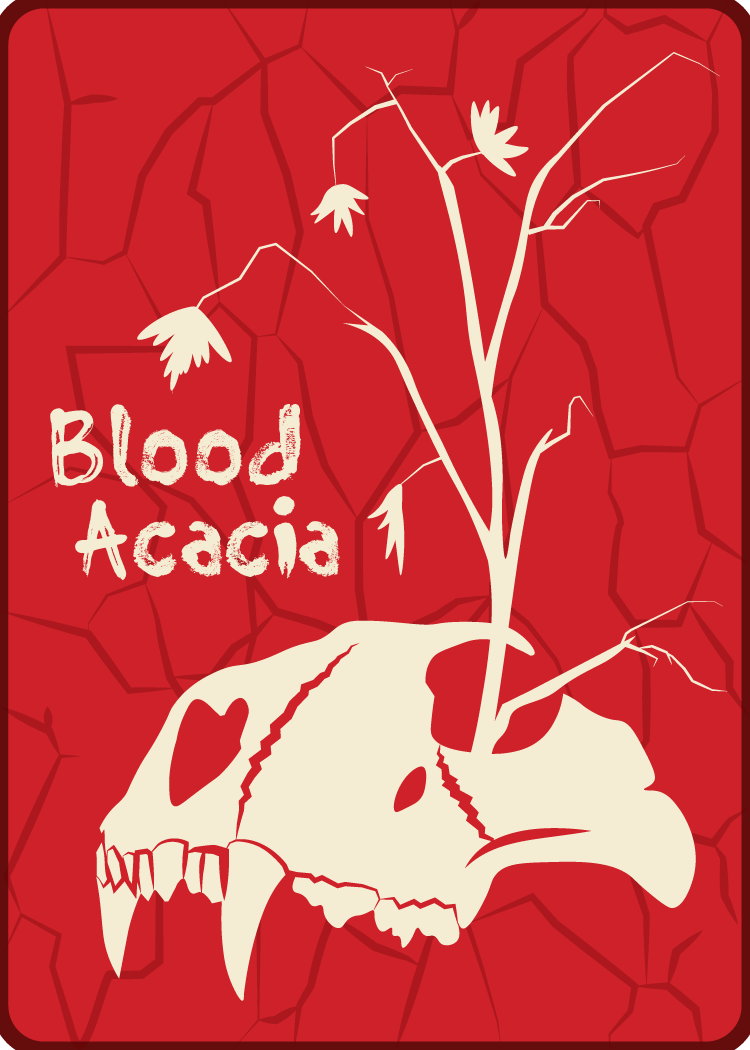 Establishing the look and feel of the game would need to accurately reflect the intended tone of the story. Blood Acacia is a gritty, brutal, and oftentimes desolating story. Life for a wild animal is already often short, violent, and distressing, and with the added narrative element of the undead, these normal pressures become even further intensified. The overall look of the trading card game was meant to reflect these elements, with plenty of natural elements like cracked earth, sand, and stone, but with the additional themes of death such as skulls, veins, and wilted foliage.