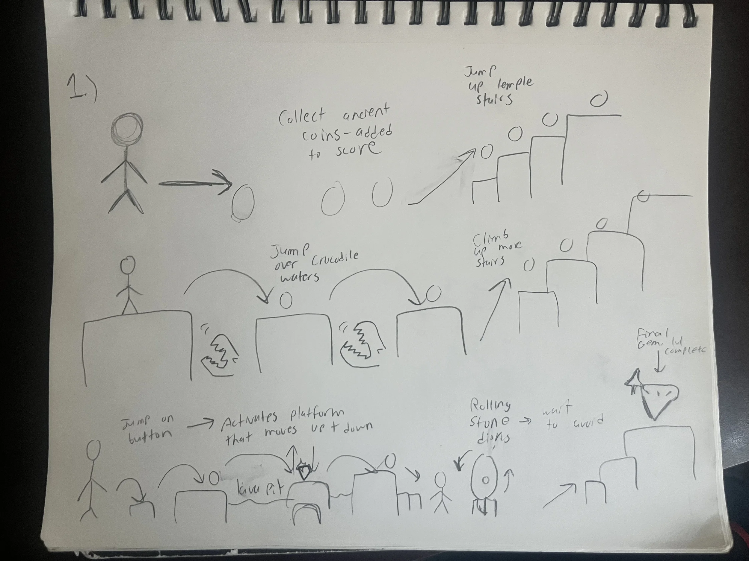 I sketched out a rough sequence of how the level would be constructed, including all of the essential gameplay mechanics needed. I also established the general tone and environment of the level, which would be a homage to classic adventure media such as Indiana Jones, with the player running through a jungle temple to collect treasure while avoiding deadly obstacles and hungry wild beasts. The project would need a name, and so Primordia was created in reference to the rough, wild aesthetic of the game.